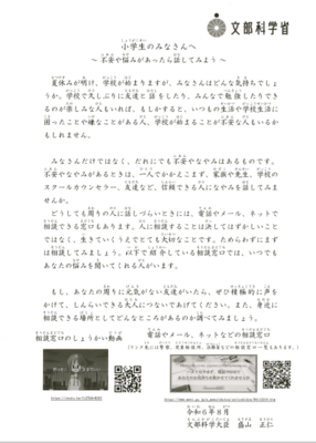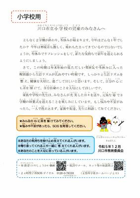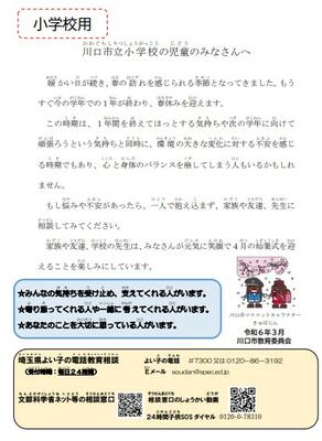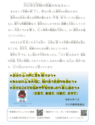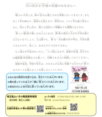 本校での川口市就学時健康診断の日程についてお知らせします。 【日程】 11月20日(木) 【受付時間】 13:00~13:20(健診開始時刻は13:30となります。) ※持ち物等、詳細については川口市から各ご家庭へ送付されている書類をご確認ください。